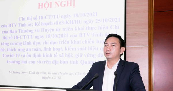 Dân trí Tỉnh Quảng Ninh vừa quyết định. Hai cán bộ lãnh đạo huyện tạm thời điều hành sau khi Bí thư Huyện ủy Chủ tịch UBND huyện Cô Tô Lê Hùng Sơn bị tố hiếp dâm cán bộ nữ. Bí thư Huyện ủy Chủ tịch UBND huyện Cô Tô Lê Hùng Sơn cho biết tính đến thời điểm hiện nay huyện Cô Tô là địa phương đầu tiên của tỉnh Quảng Ninh đã hoàn thành công tác tiêm chủng diện rộng mũi 2 vaccine phòng Covid-19 cho 100 người dân.